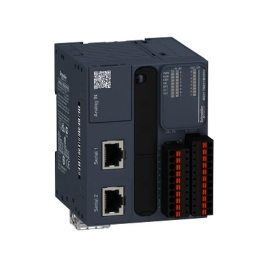 It is a Modicon M221 controller with 256kB for user application and data RAM, internal variables RAM, 256kB built-in flash memory and a SD card memory capacity of 2GB.