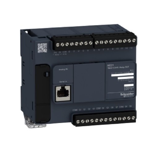 It is a Modicon M221 controller with a network frequency of 50/60Hz, 256KB for internal variables RAM, user application and data RAM, a built-in flash memory of 256KB and a SD card memory capacity of 2GB.