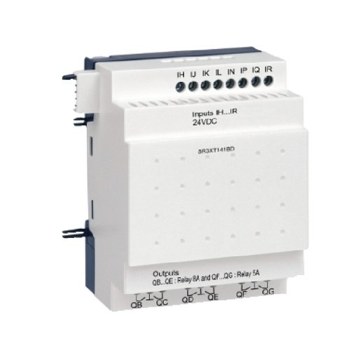 This Zelio Logic SR3 discrete I/O extension module smart relays uses a supply voltage of 24V direct current.