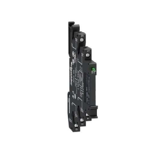 This Harmony RSL slim interfacing plug-in relay has a coil control voltage of 24V DC and has 1 changeover contact SPDT (single pole double throw) with a rating of 6A.